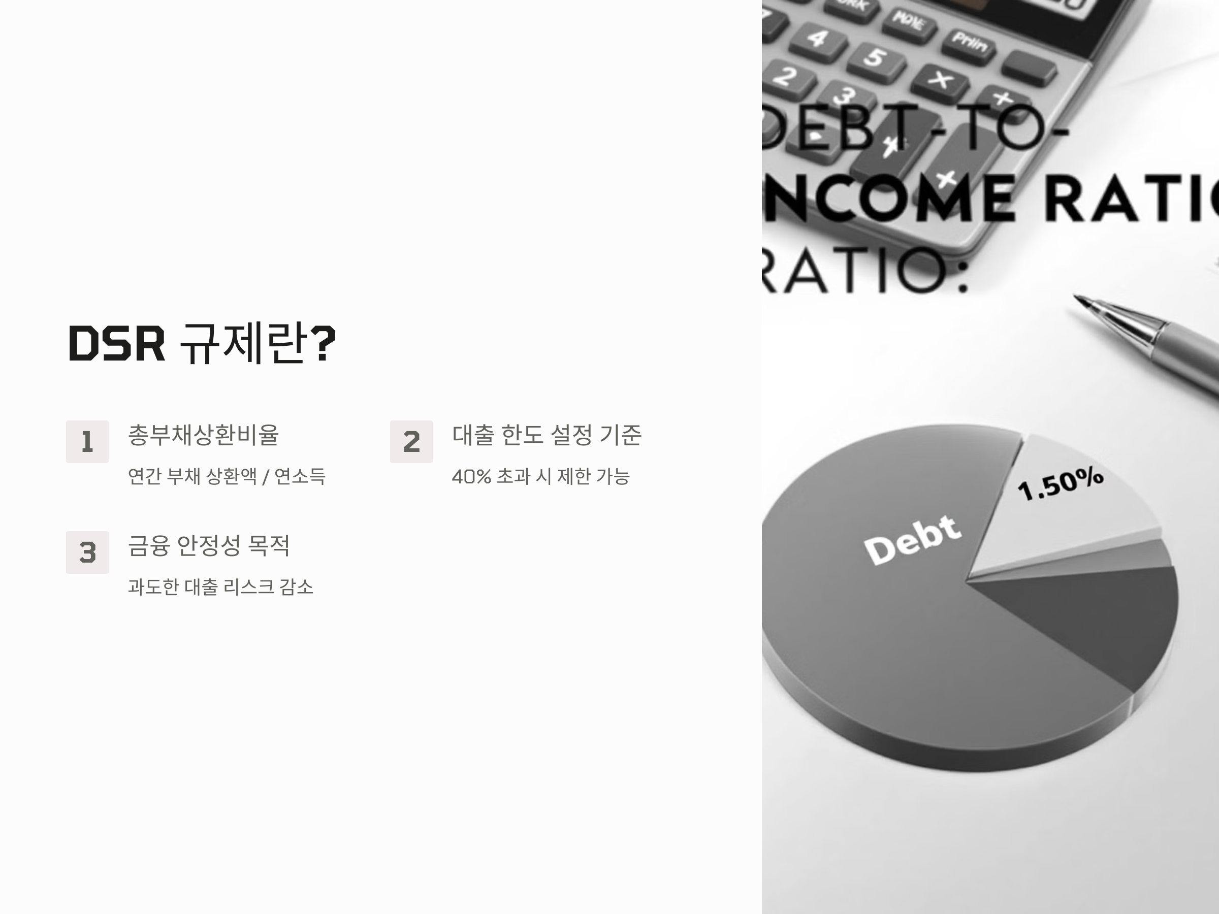 최근 금융권에서 자주 언급되는 DSR(총부채상환비율) 규제는 대출을 고려하는 사람들에게 큰 영향을 미치는 중요한 지표입니다. DSR은 개인이 가진 모든 부채의 연간 상환액이 연소득에서 차지하는 비율을 의미합니다. 이 규제는 과도한 대출로 인한 리스크를 줄이고, 금융시장의 안정성을 높이기 위한 목적으로 도입되었습니다.
