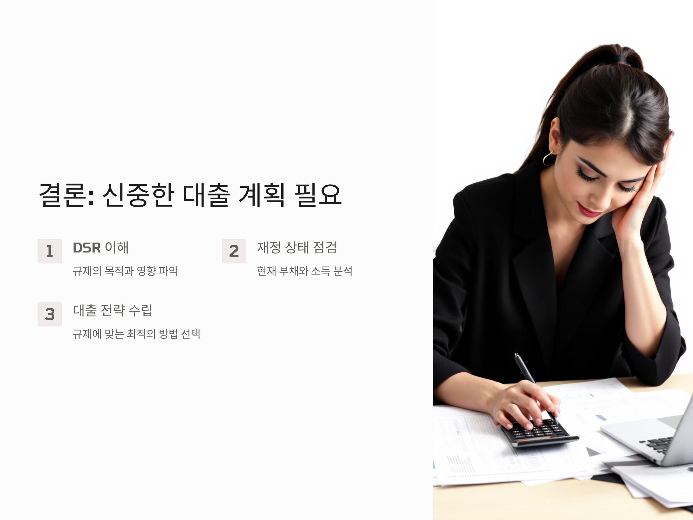 DSR 규제는 대출자의 상환 능력을 고려해 과도한 대출을 방지하는 중요한 역할을 하고 있습니다. 이를 통해 금융시장의 안정성을 높이려는 목적이 있지만, 대출을 받으려는 사람들에게는 큰 제약으로 작용할 수 있습니다. 따라서 DSR 규제를 충분히 이해하고, 규제를 피할 수 있는 방법을 미리 준비하는 것이 중요합니다.