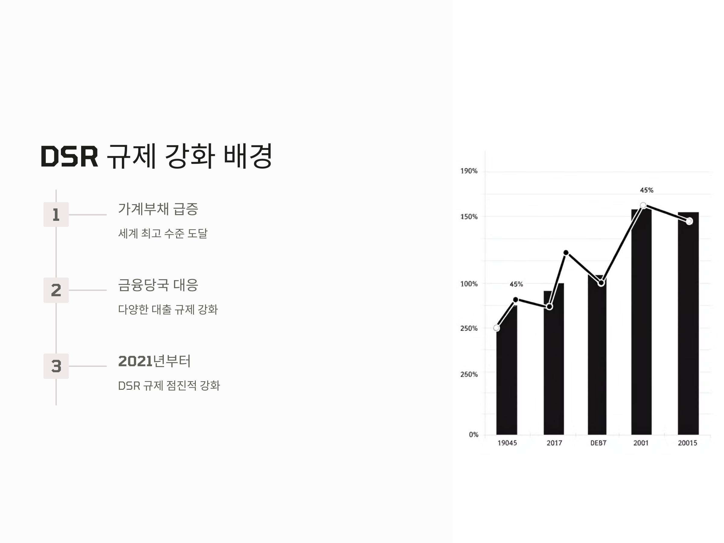 DSR 규제가 강화된 배경에는 가계부채의 급증과 관련된 여러 우려가 있습니다. 한국은 가계부채 비율이 세계 최고 수준에 달하고 있어, 금융당국은 이러한 상황을 개선하기 위해 DSR을 포함한 다양한 대출 규제를 강화하고 있습니다.