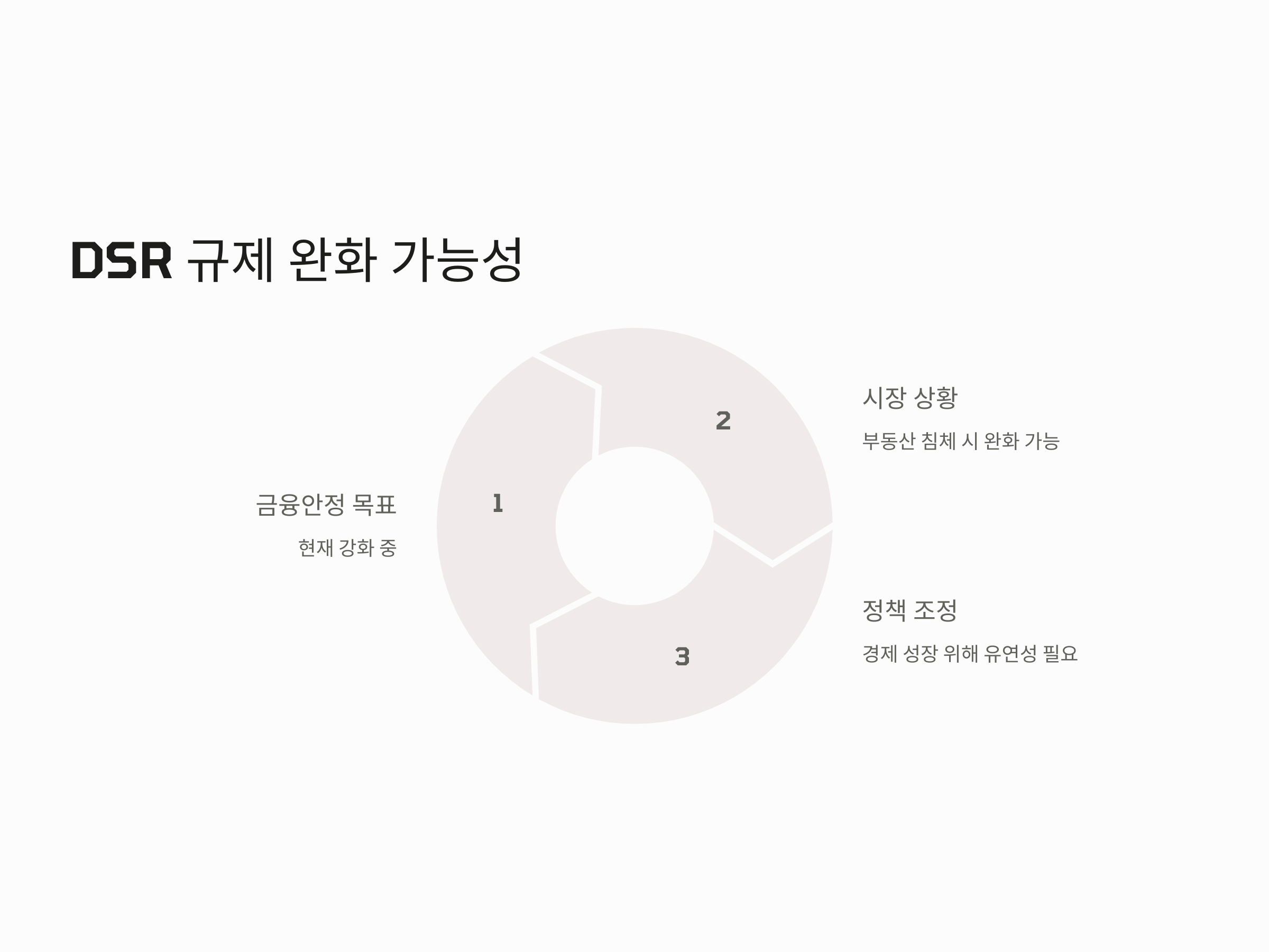 현재 DSR 규제는 금융안정을 목표로 강화되고 있지만, 앞으로 완화될 가능성도 존재합니다. 가계부채가 지나치게 증가하거나, 주택시장 침체가 심화될 경우, 금융당국은 이를 완화하기 위한 정책을 시행할 수 있습니다. 특히, 정부는 부동산 시장의 활성화와 경제 성장을 위해 일부 규제를 유연하게 조정할 가능성도 있습니다.