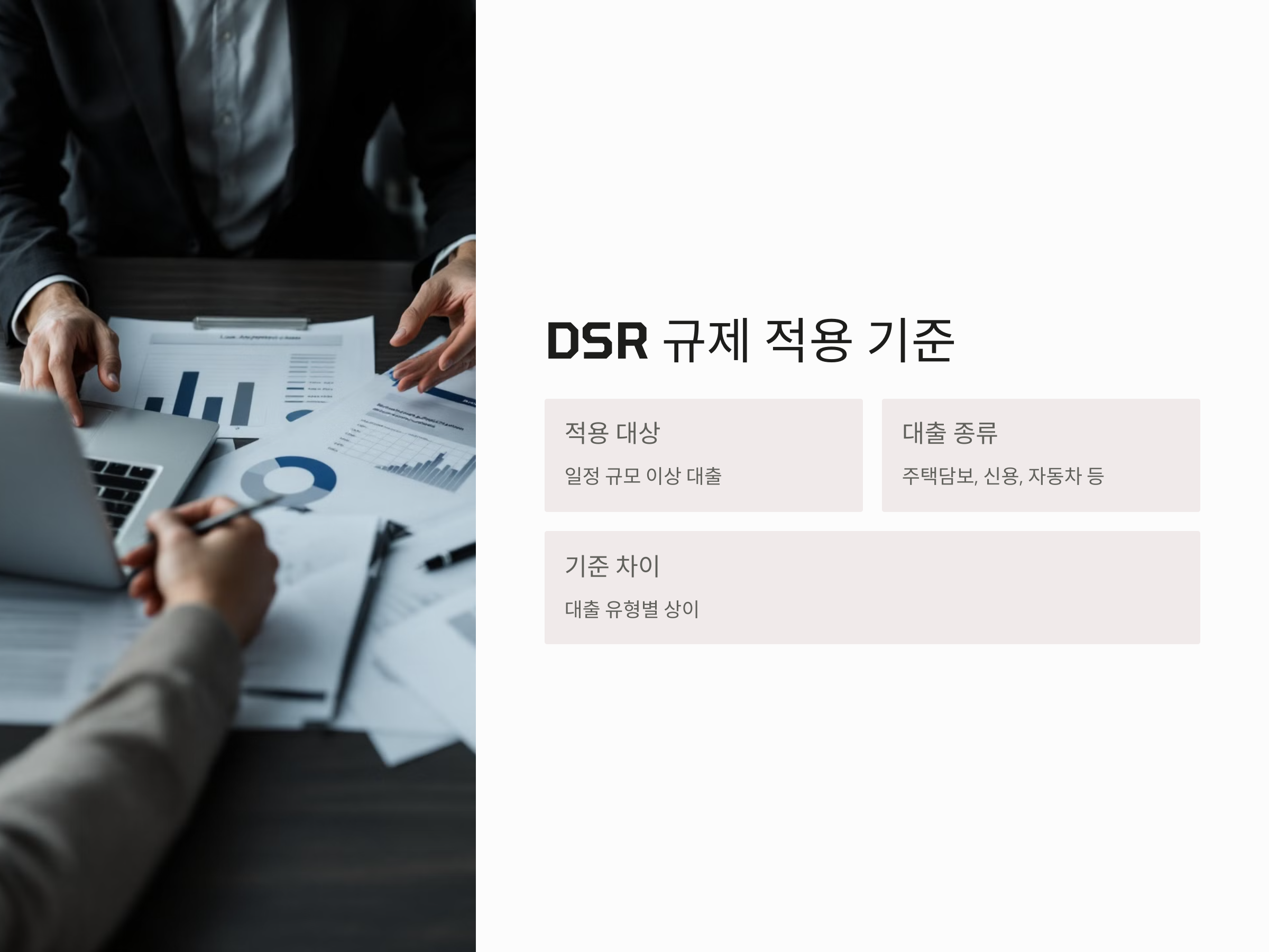 DSR 규제는 모든 대출에 적용되는 것이 아니라, 일정 규모 이상의 대출에 대해서만 적용됩니다. 보통 주택담보대출, 신용대출, 자동차 대출 등 여러 가지 종류의 대출이 포함됩니다. 하지만 각 대출 유형에 따라 적용되는 DSR 기준은 다를 수 있습니다.