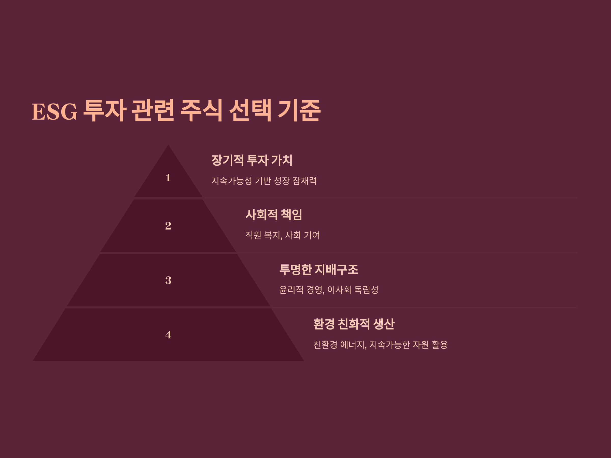 ESG 투자에서 중요한 점은 관련 주식을 선택할 때 ESG 요소가 잘 반영된 기업을 찾는 것입니다. 기업이 환경적으로 지속 가능하고, 사회적 책임을 다하며, 투명한 지배구조를 갖추고 있다면, 이러한 기업은 장기적으로 더 높은 투자 가치를 지닐 가능성이 높습니다.