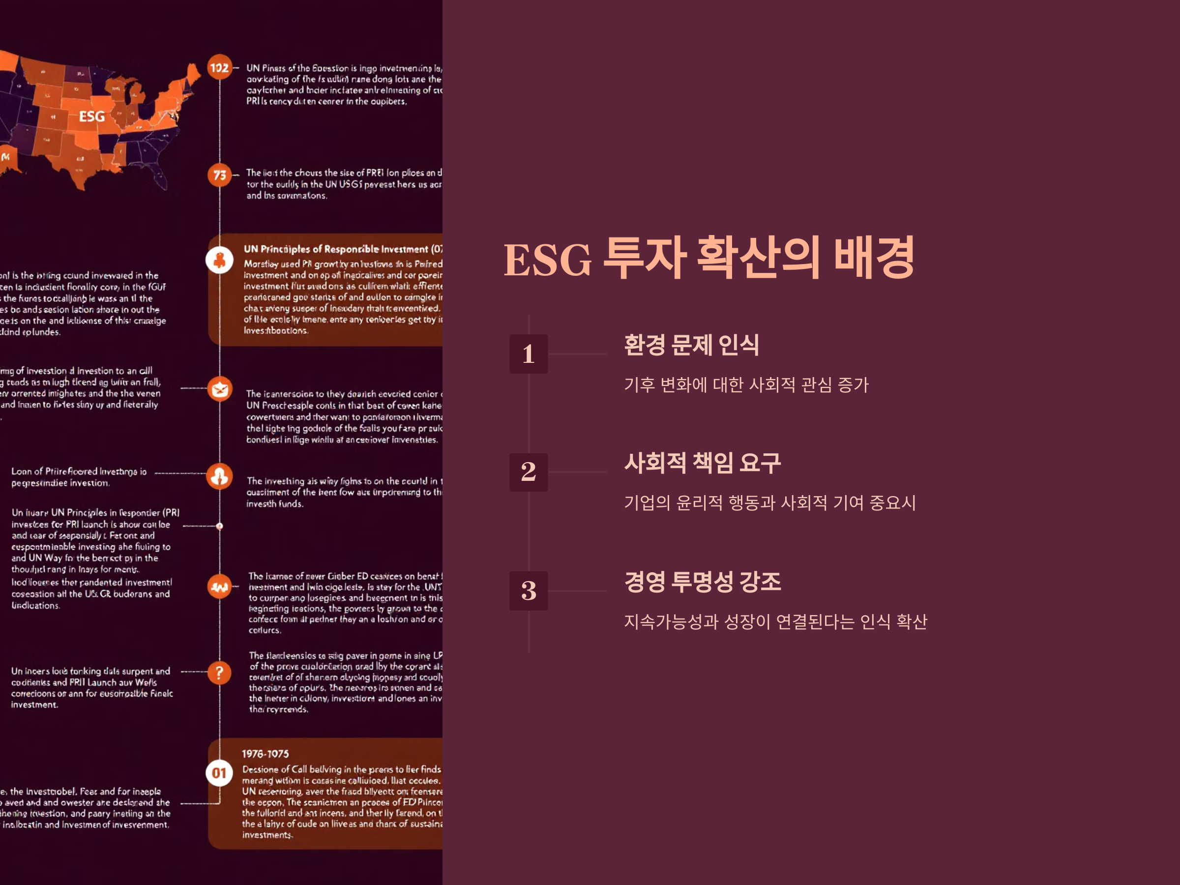 이러한 배경 속에서 ESG 투자는 점차 필수적인 투자 전략으로 자리 잡고 있으며, 투자자들이 기업의 단기적인 재무 성과뿐만 아니라 장기적인 지속 가능성까지 고려하기 시작했습니다.