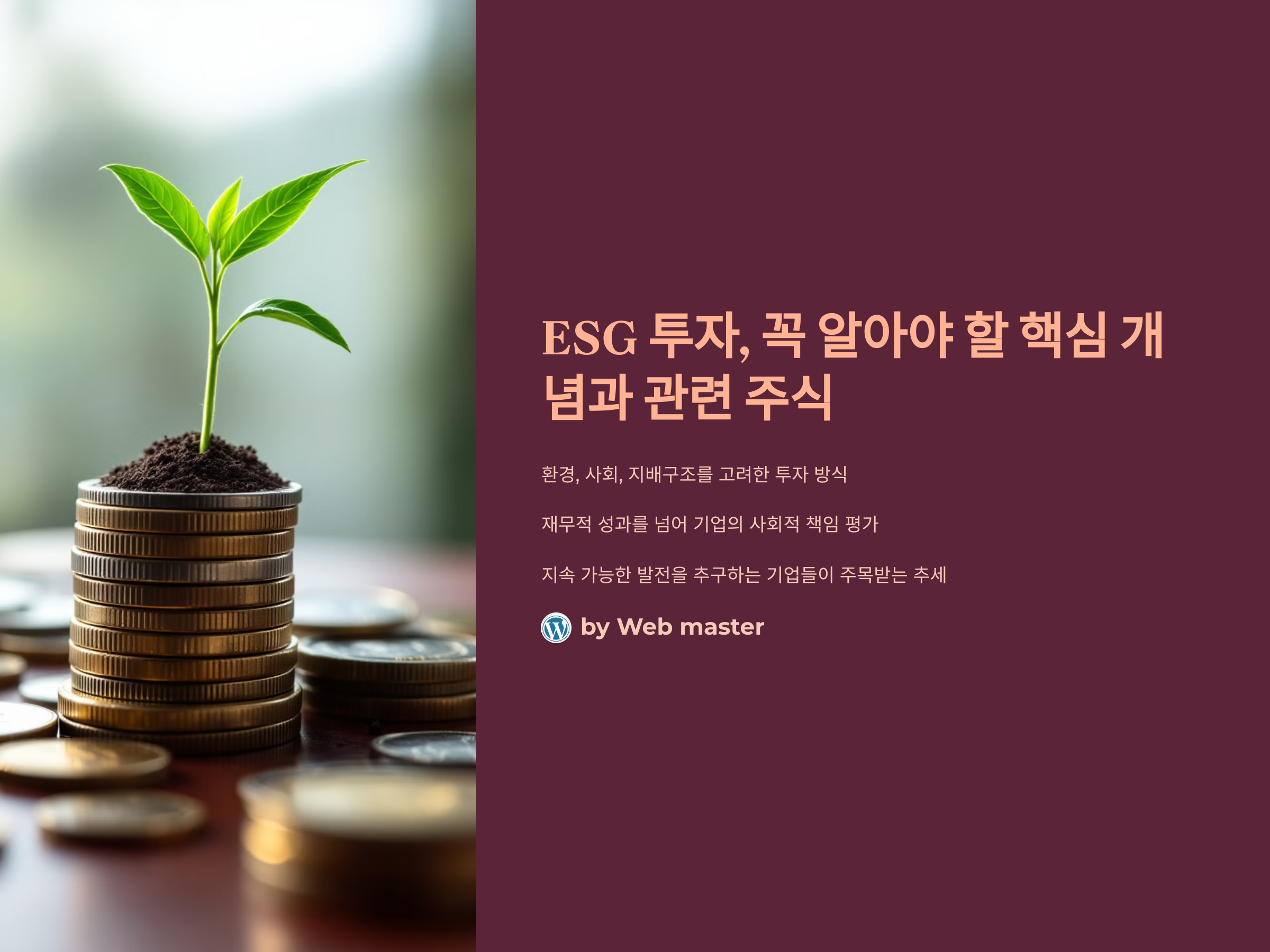 ESG 투자란 무엇인가요? ESG는 Environmental(환경), Social(사회), Governance(지배구조)의 약자로, 기업이 사회적 책임을 다하고 있는지를 평가하는 투자 방식입니다. 단순히 재무적인 성과를 넘어서, 환경 보호, 사회적 기여, 투명한 지배구조 등이 중요한 투자 기준으로 작용합니다. 오늘은 ESG 투자에 대해 자세히 알아보고, ESG 관련 주식에 대해 살펴보겠습니다.