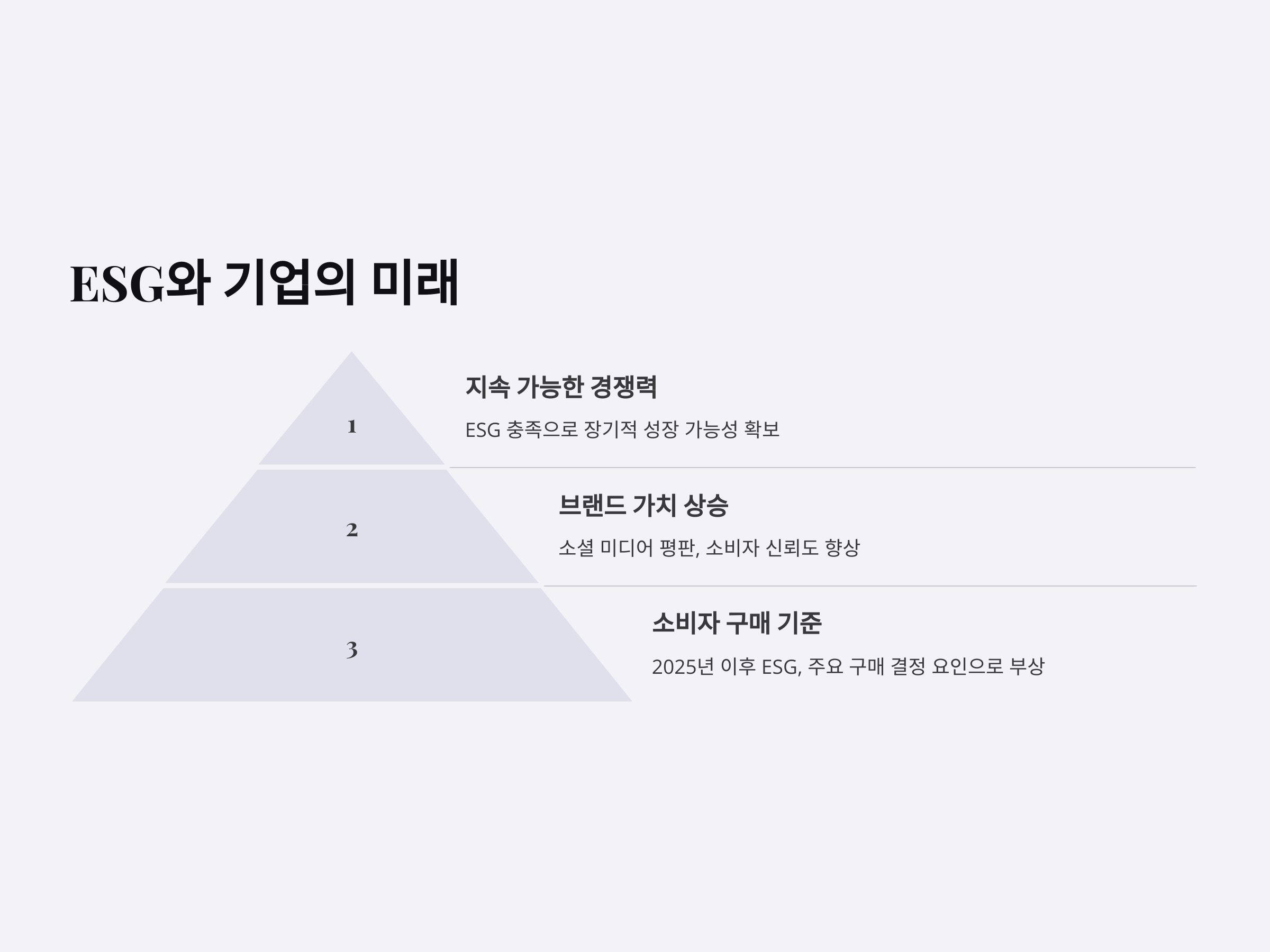 2025년 이후 ESG는 단순히 투자자들에게만 중요한 요소가 아니라, 소비자들에게도 중요한 구매 기준으로 작용할 것입니다. 따라서 기업들은 ESG를 경영의 중심에 두고, 환경 친화적인 제품을 개발하거나, 사회적 가치를 창출하는 활동을 강화할 필요가 있습니다.