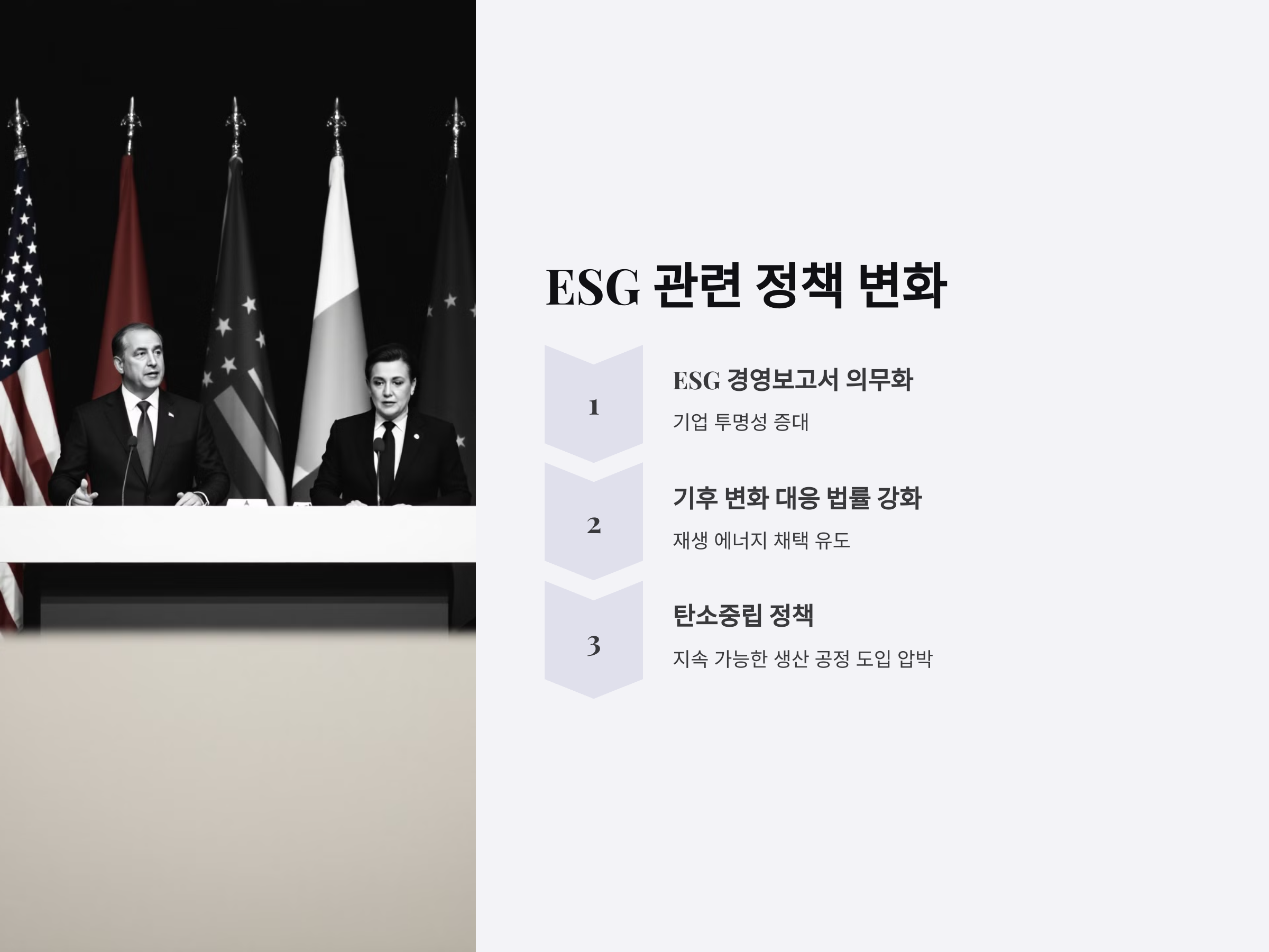 ESG 투자 트렌드는 기업뿐만 아니라 정부의 정책에도 큰 영향을 미치고 있습니다. 각국 정부는 ESG 관련 규제와 지침을 마련하여, 기업들이 ESG 기준을 따르도록 유도하고 있습니다. 2023년부터는 ESG 경영보고서의 제출이 의무화된 기업들이 많아졌으며, 특히 기후 변화 대응과 관련된 법률이 강화되었습니다. 이는 ESG 투자자들에게 더 많은 정보를 제공하며, 기업들이 더욱 투명하게 경영을 해야 하는 압박을 가중시키고 있습니다.