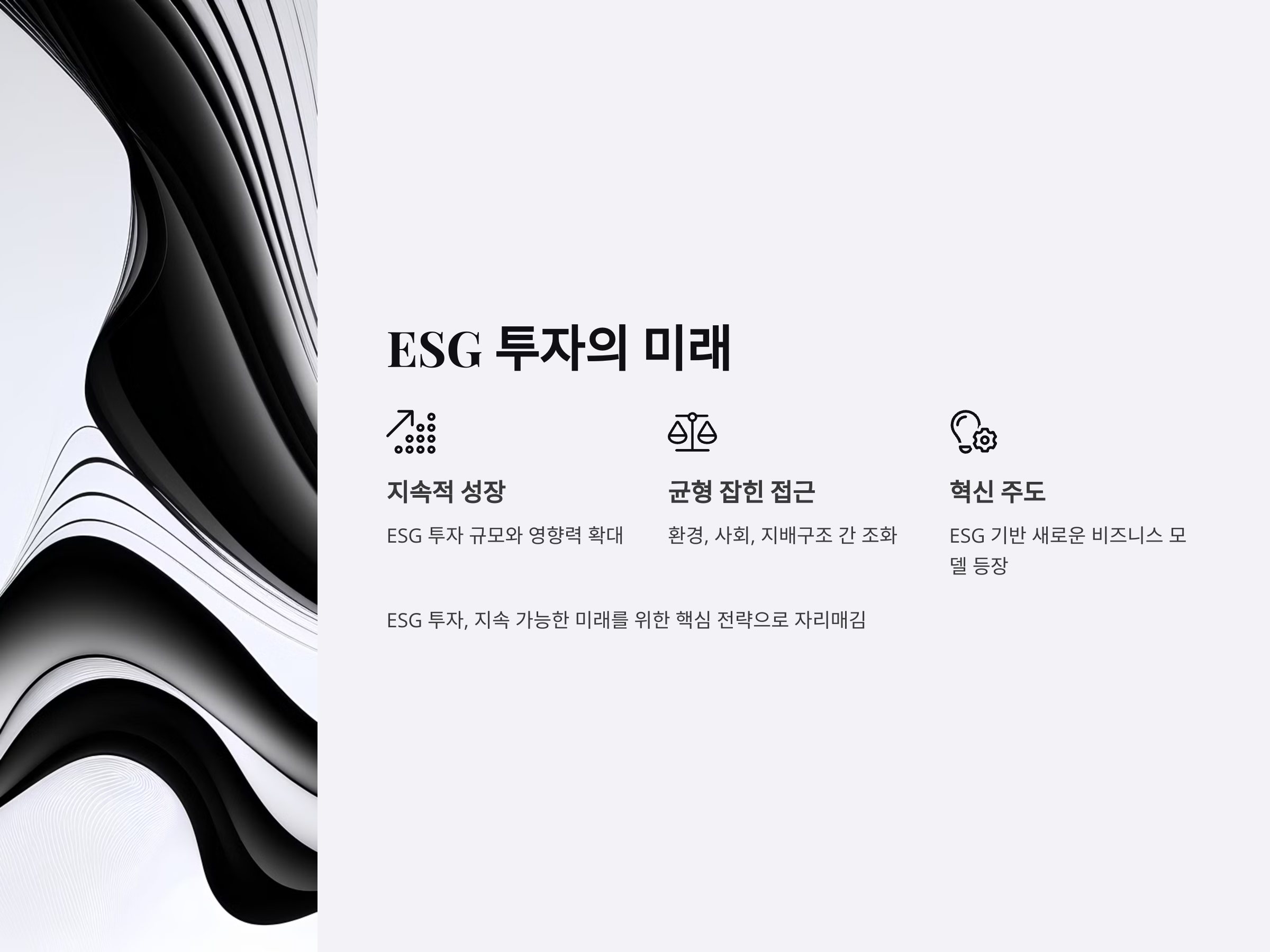 ESG 투자 트렌드는 앞으로도 지속적으로 강력한 영향력을 발휘할 것입니다. 투자자들은 ESG를 고려한 투자를 통해 장기적 안정성과 지속 가능한 성장을 추구하고, 기업들도 이에 맞춰 ESG 경영을 강화해야 할 시점에 왔습니다. 이제 ESG는 투자뿐만 아니라 기업 경영의 핵심 요소로 자리잡고 있으며, 이를 적극적으로 실천하는 기업들이 글로벌 시장에서 승승장구할 것입니다.