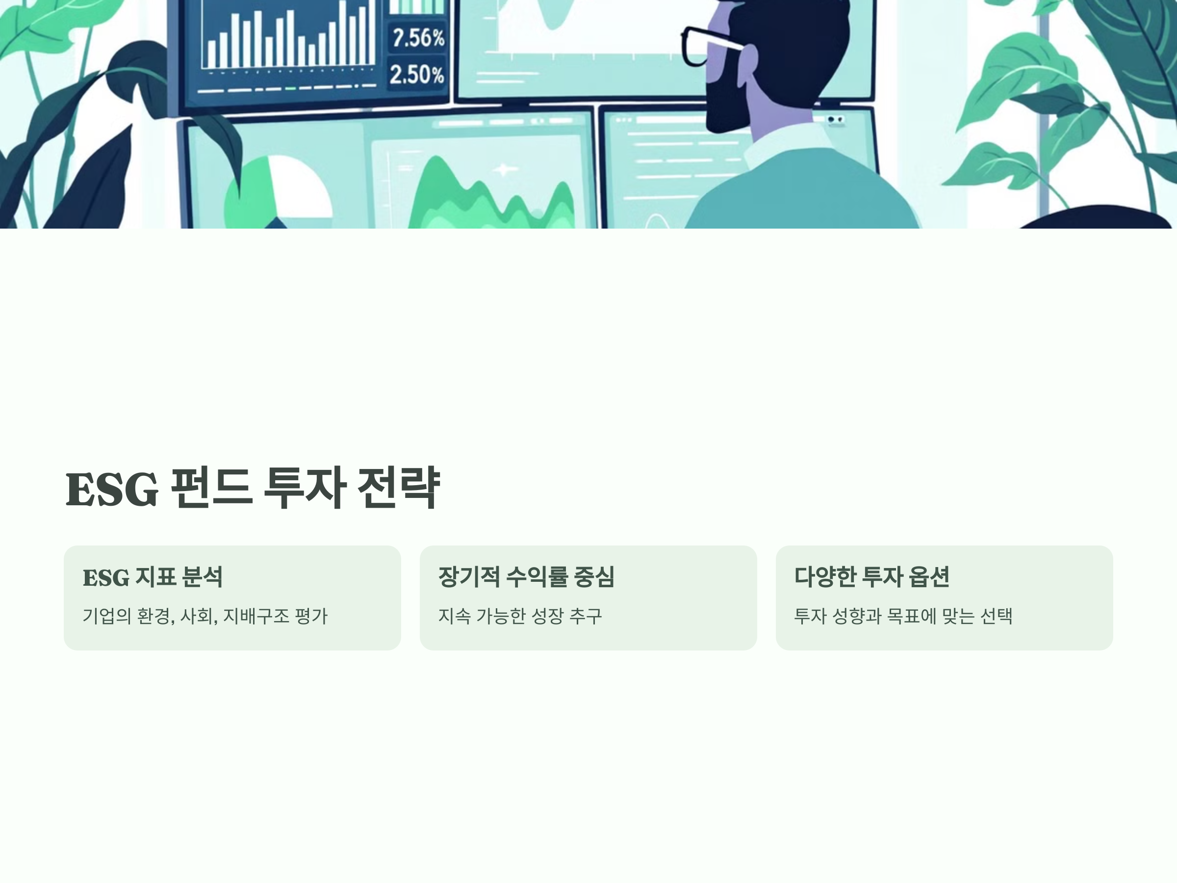 ESG 펀드에 투자하는 데 있어 중요한 전략은 무엇일까요? 첫 번째로, ESG 지표를 잘 분석하는 것이 중요합니다. ESG 지표는 기업이 환경, 사회, 지배구조 측면에서 얼마나 책임을 다하고 있는지를 평가하는 기준으로, 이를 바탕으로 투자 결정을 내리는 것이 필요합니다. 또한, ESG 펀드의 성과를 다른 펀드와 비교할 때, 장기적인 수익률을 중심으로 평가해야 합니다. 단기적인 성과보다는 지속 가능한 성장을 위한 장기적인 안목을 갖고 투자하는 것이 중요합니다.