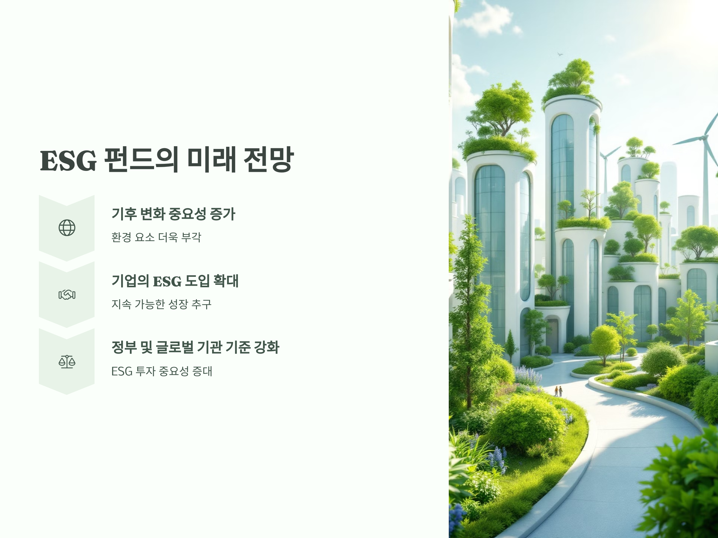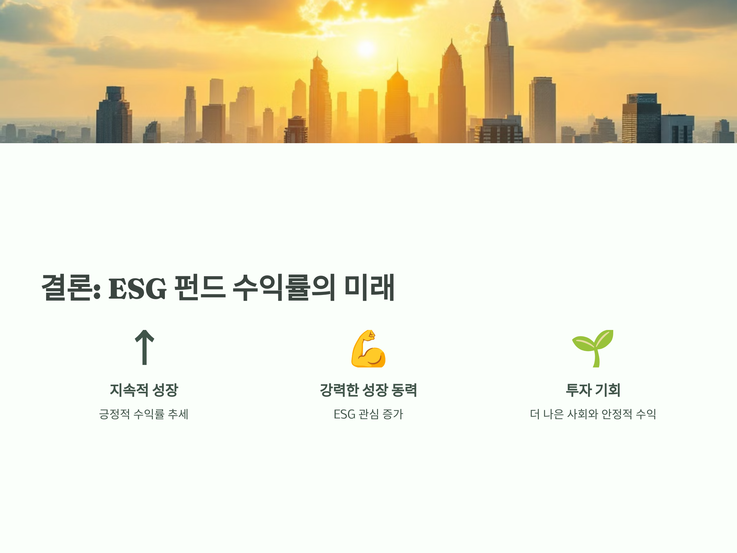 ESG 투자에 대한 관심이 증가함에 따라, ESG 펀드의 수익률도 긍정적인 방향으로 나아갈 것입니다. 투자자들은 환경 및 사회적 책임을 다하는 기업들을 지원함으로써 더 나은 사회를 만들 수 있을 뿐만 아니라, 장기적으로 더 높은 수익률을 기대할 수 있습니다. ESG 펀드는 단순한 도덕적 투자 이상의 가치를 제공하며, 지속 가능한 경제 성장을 위해 중요한 역할을 할 것입니다.