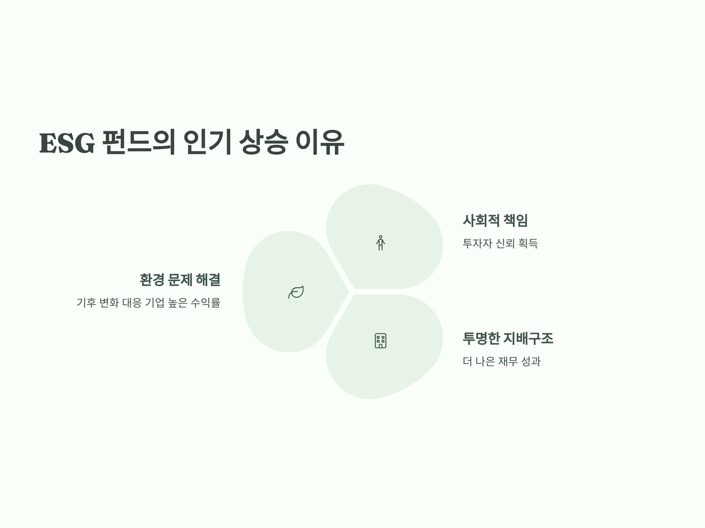 ESG 펀드의 성장은 단순히 투자자들의 도덕적 가치관에 의한 것이 아닙니다. 기업들이 ESG 요소를 개선하면서 실질적인 경제적 성과를 이루었기 때문입니다. 환경 문제를 해결하고, 사회적 책임을 다하며, 투명한 지배구조를 유지하는 기업들이 시장에서 더 높은 신뢰를 얻고, 더 나은 재무 성과를 보여주었기 때문에 ESG 펀드에 대한 투자도 급증한 것입니다. 특히 기후 변화와 관련된 문제에 적극적으로 대응하는 기업들이 높은 투자 수익률을 기록하면서 ESG 펀드의 매력은 더욱 커졌습니다.