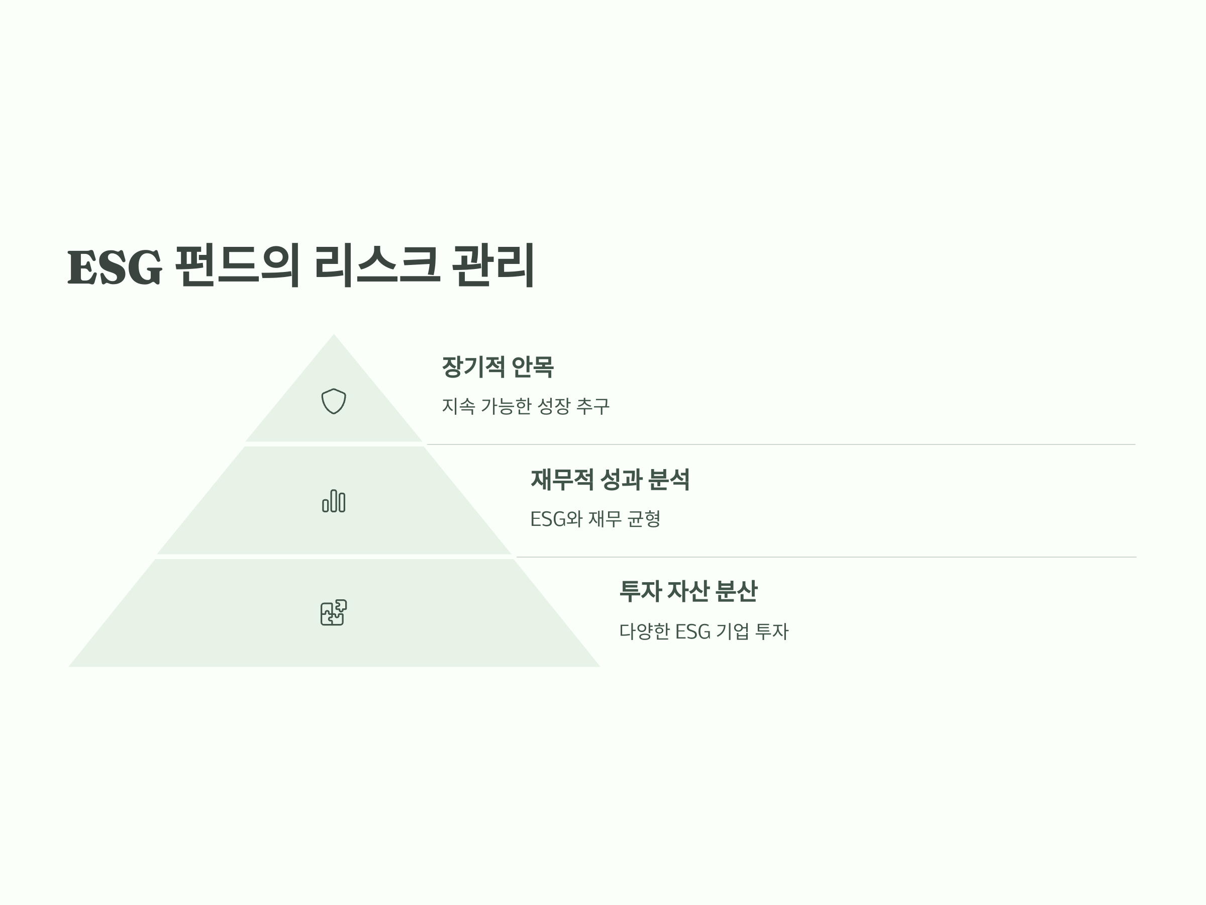 ESG 펀드는 긍정적인 수익률을 기록하지만, 그럼에도 불구하고 리스크 관리가 중요합니다. ESG 펀드는 특정 산업이나 분야에 집중하기 때문에, 그 산업의 변화나 정책에 따라 성과가 달라질 수 있습니다. 예를 들어, 기후 변화 관련 정책이나 정부 규제가 ESG 기업에 미치는 영향을 잘 분석하고, 리스크를 분산하는 전략을 세우는 것이 중요합니다.