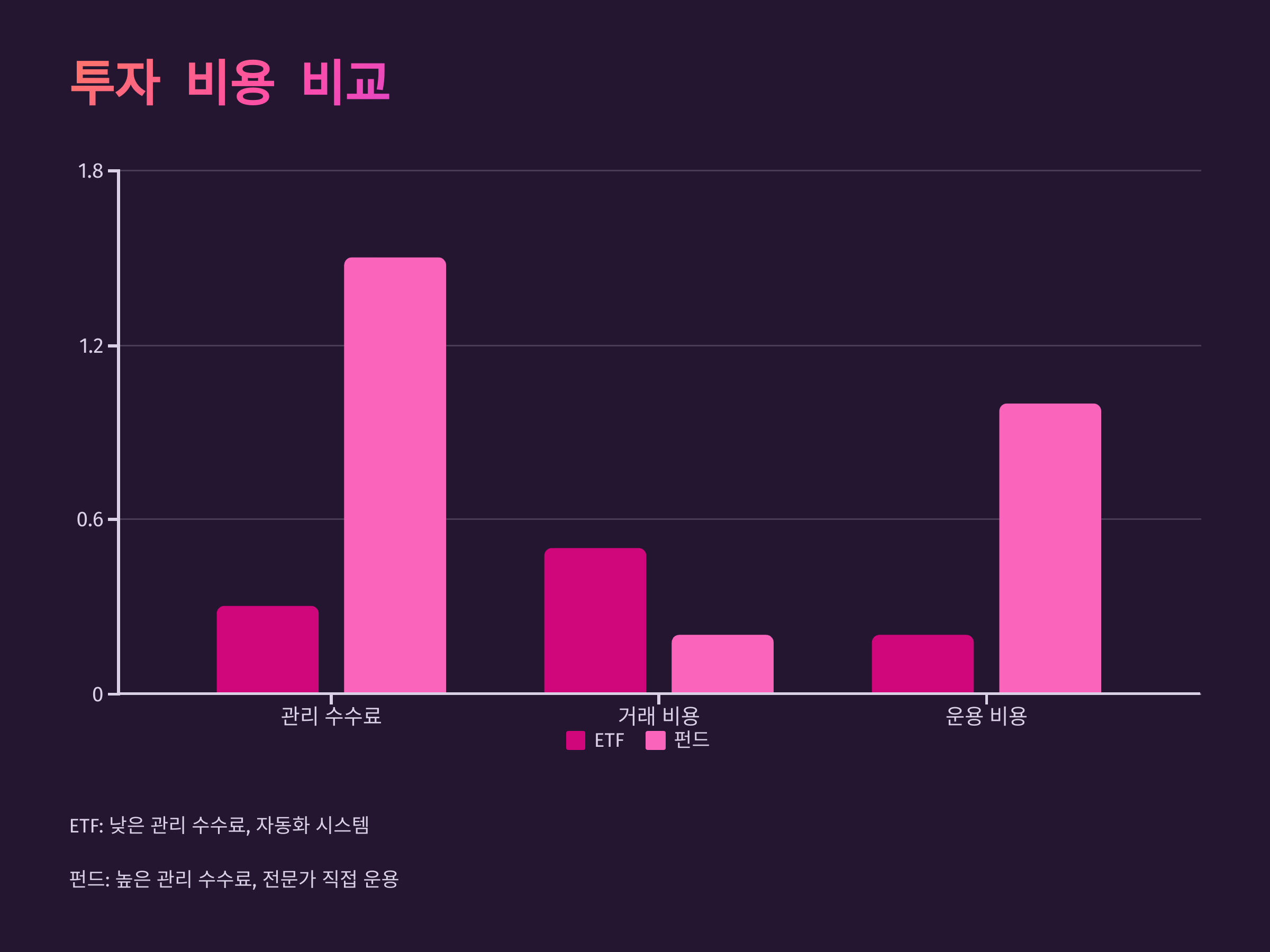 ETF와 전통적인 펀드는 각각의 투자 비용에서 큰 차이를 보입니다. ETF는 일반적으로 낮은 관리 수수료를 부과합니다. ETF는 지수를 추종하는 방식으로 자동화된 시스템을 통해 운영되기 때문에, 운용에 드는 비용이 상대적으로 적습니다. 또한, ETF는 개별 주식처럼 거래되므로 거래 시 발생하는 매매 수수료는 투자자가 부담해야 하지만, 장기적으로 보면 관리 비용이 절감되는 효과를 볼 수 있습니다.