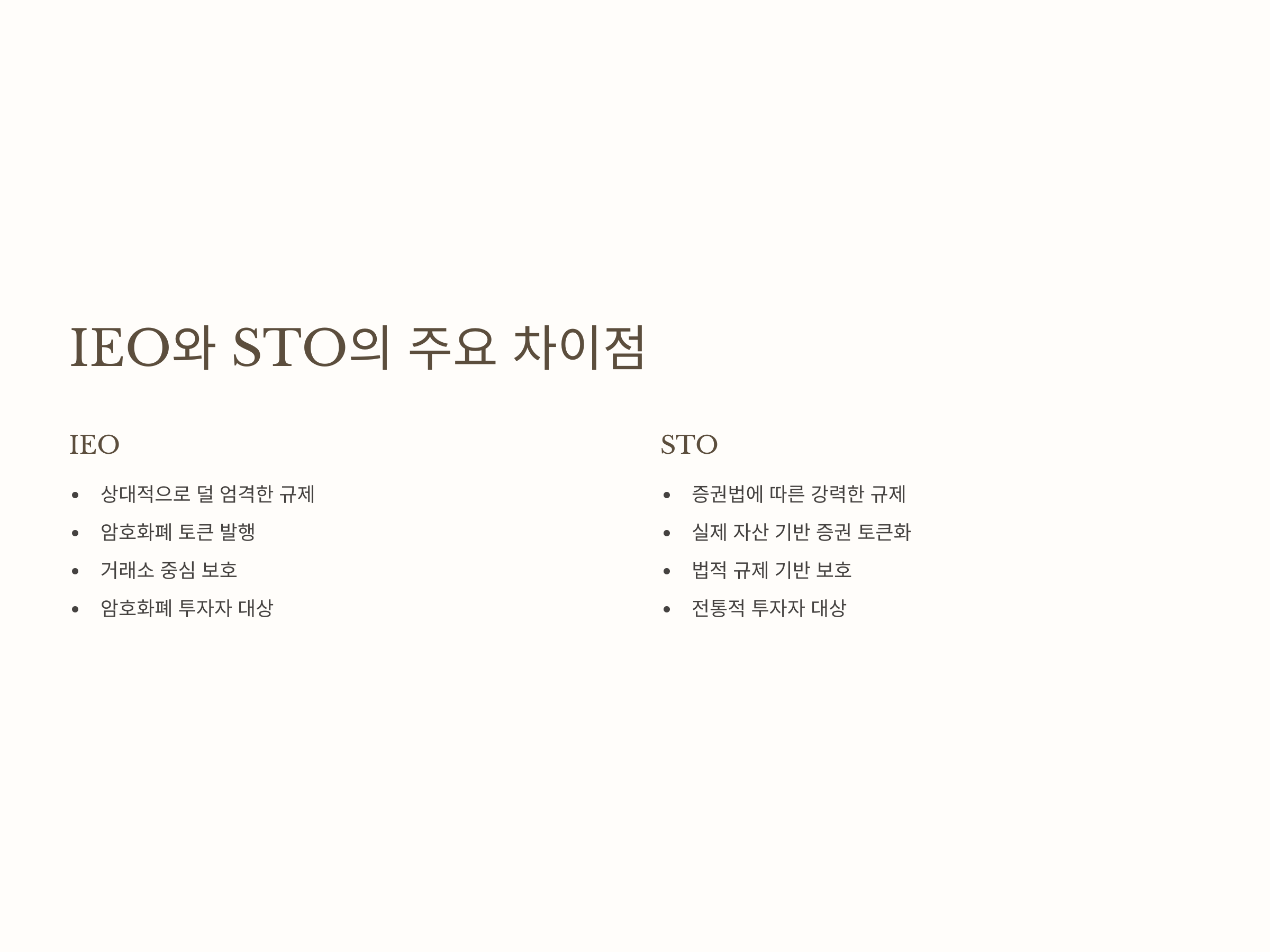 IEO(Initial Exchange Offering)와 STO(Security Token Offering)는 각각 암호화폐와 블록체인 기술을 활용한 새로운 형태의 투자 모델입니다. 전통적인 투자 방법에서 벗어나, 이 두 모델은 투자자들에게 더 안전하고 효율적인 방식으로 자금을 모집할 수 있는 기회를 제공합니다. 하지만 이 두 가지는 그 목적, 규제 수준, 그리고 투자자의 경험에서 큰 차이를 보입니다. 이번 글에서는 IEO와 STO의 주요 차이점과 각 모델이 가진 특징을 살펴보겠습니다.