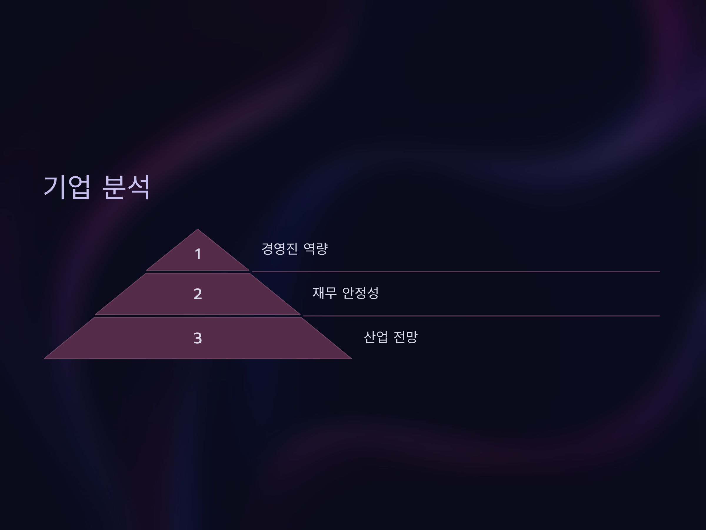 - 경영진: 경영진의 역량도 매우 중요합니다. 경험이 풍부한 경영진이 이끌고 있는 기업은 안정적인 성장을 할 가능성이 큽니다.