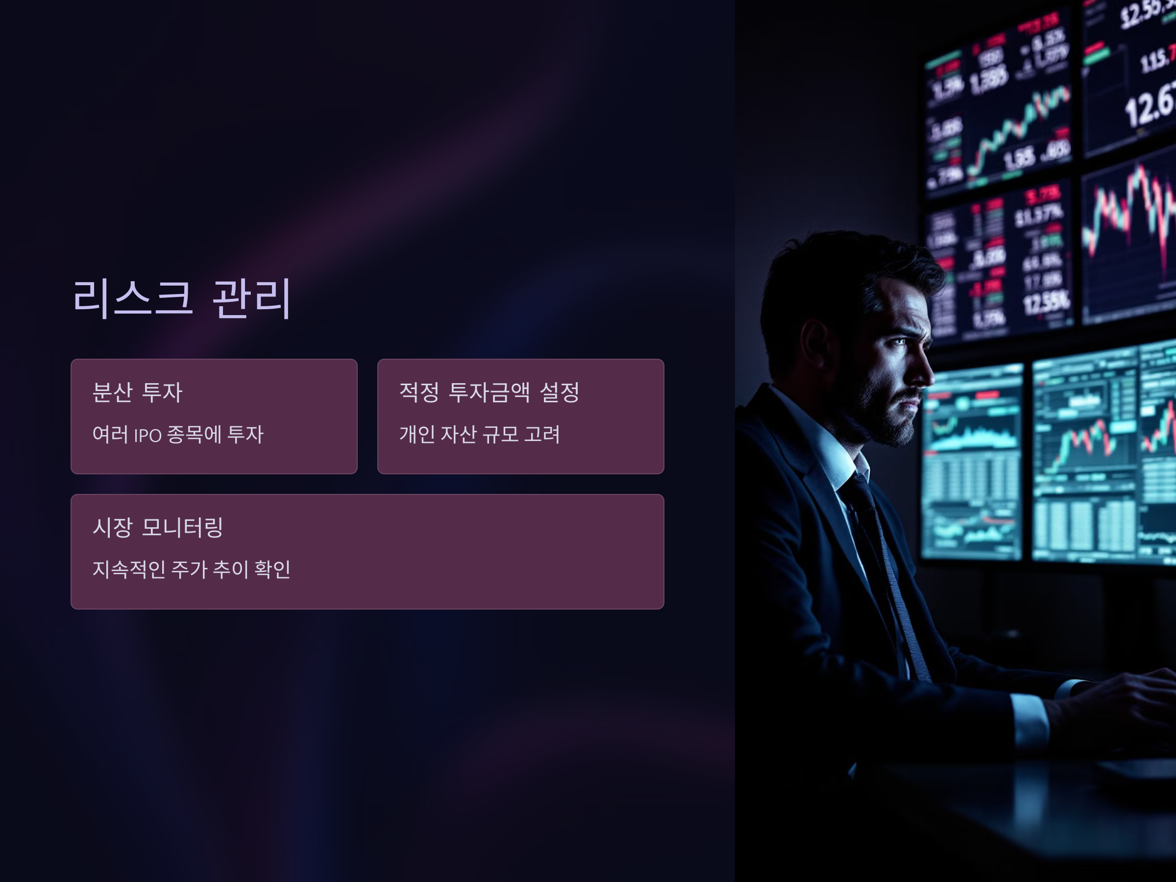 IPO 공모주는 고수익을 얻을 수 있는 기회를 제공하지만, 리스크도 존재합니다. 리스크 관리가 제대로 되지 않으면 큰 손실을 입을 수 있습니다. 따라서, IPO 공모주 투자 시에는 분산 투자, 적정 투자 금액 설정 등을 통해 리스크를 최소화하는 전략이 필요합니다.