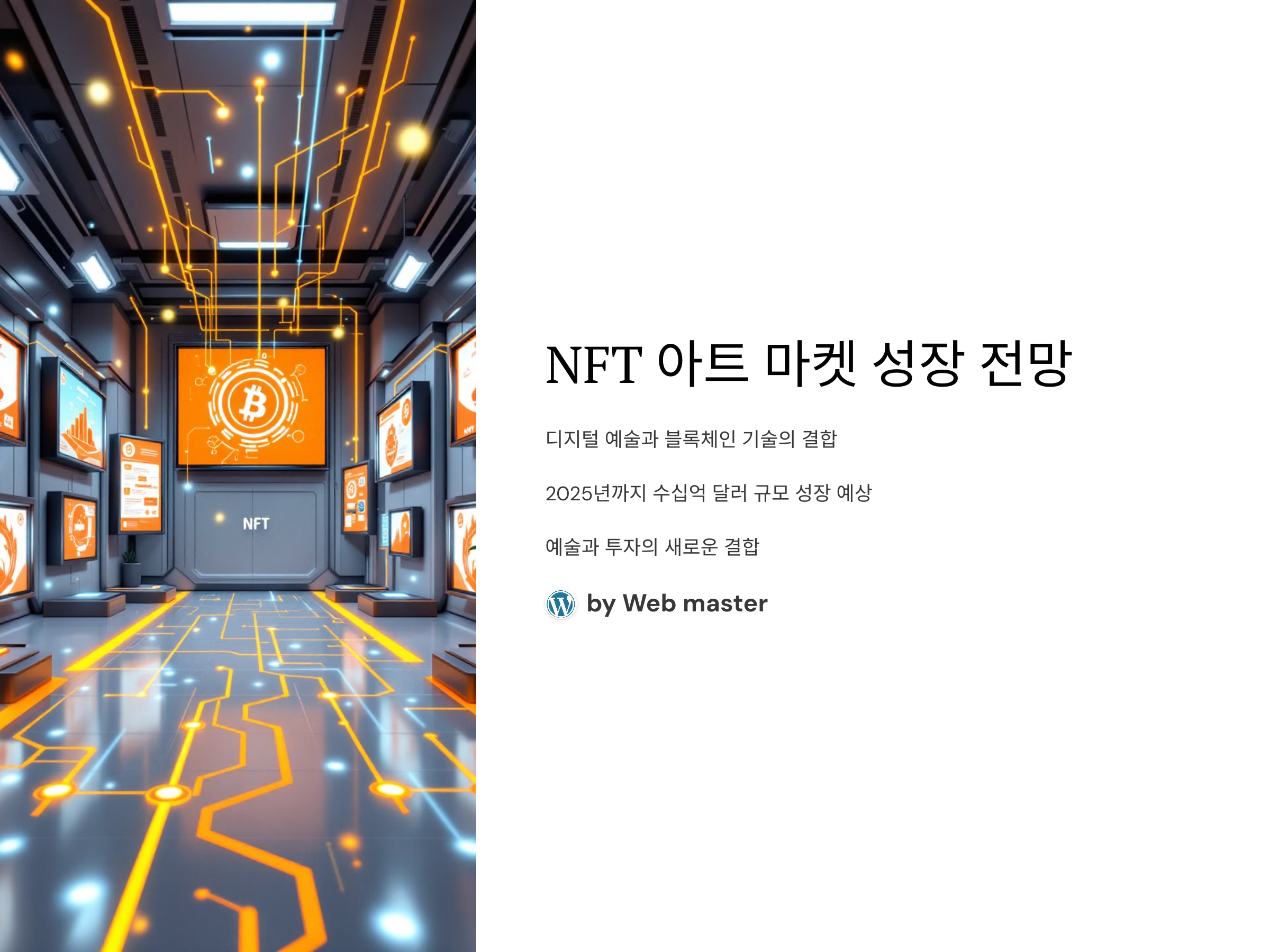 NFT 아트 시장은 앞으로 더욱 빠르게 성장할 것으로 예상됩니다. 주요 기업들이 NFT 아트를 마케팅 도구로 채택하고, 유명 아티스트들이 디지털 아트 시장에 참여함에 따라, NFT 아트는 더욱 대중화될 것입니다. 또한, 블록체인 기술의 발전으로 NFT 아트의 거래와 소유가 더욱 안전하고 효율적으로 이루어질 수 있는 환경이 구축되고 있습니다.