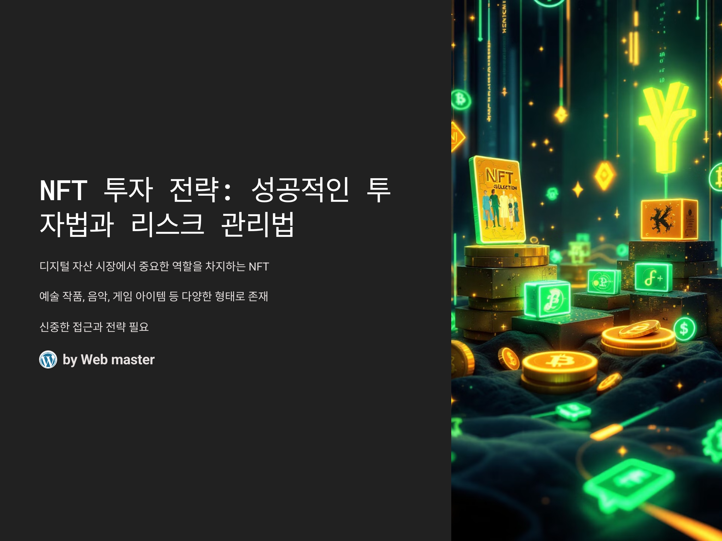 NFT는 흥미롭고 유망한 투자처일 수 있지만, 그만큼 리스크도 큽니다. 따라서 NFT에 대한 철저한 연구와 시장 분석이 필요합니다. 잘 준비된 투자 전략을 통해 NFT 시장에서 성공적인 투자자가 되어 보세요!