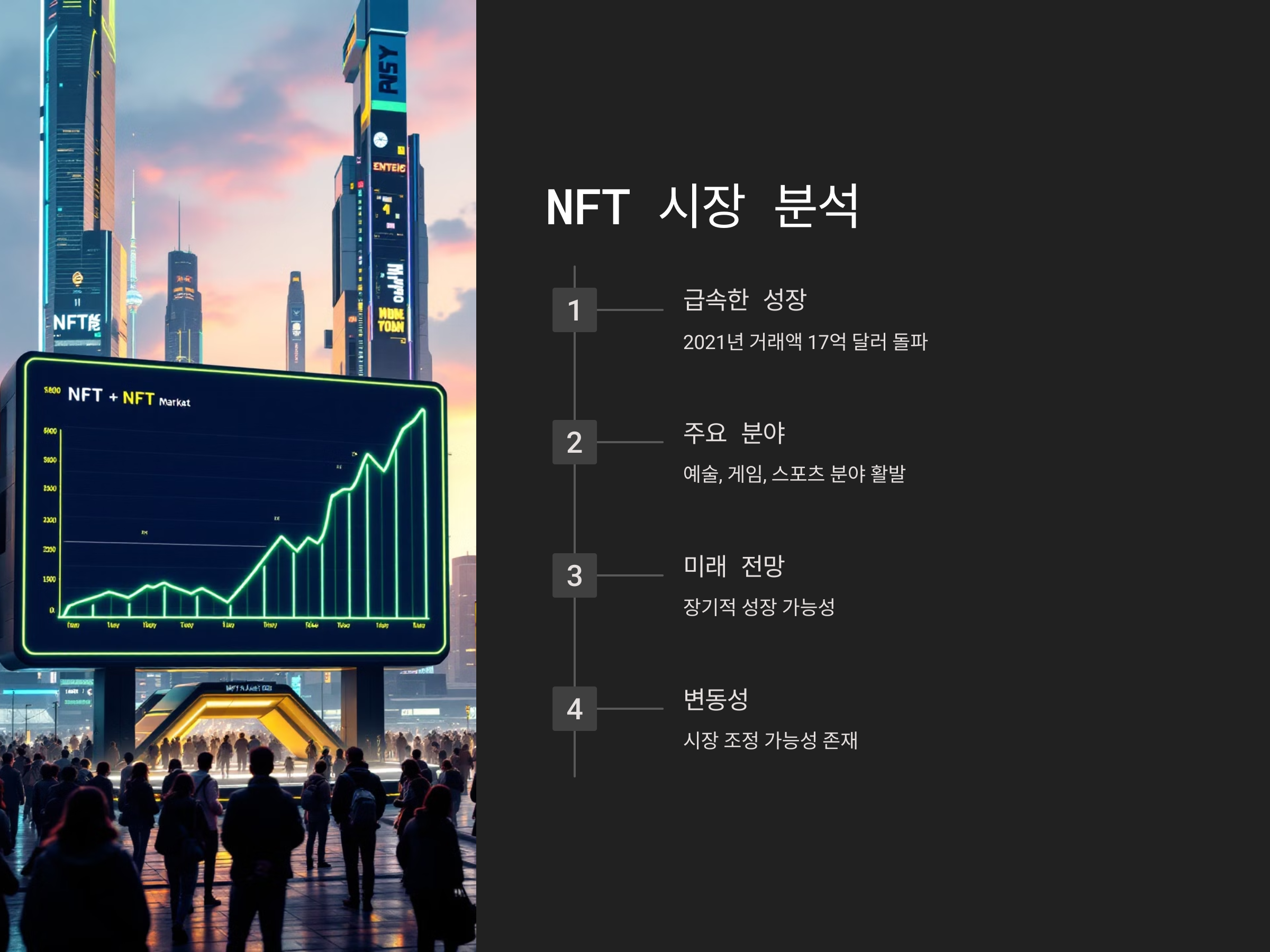 NFT가 장기적으로 성장할 가능성은 크지만, 그 과정에서 여러 번의 시장 조정이나 하락이 있을 수 있다는 점도 고려해야 합니다.