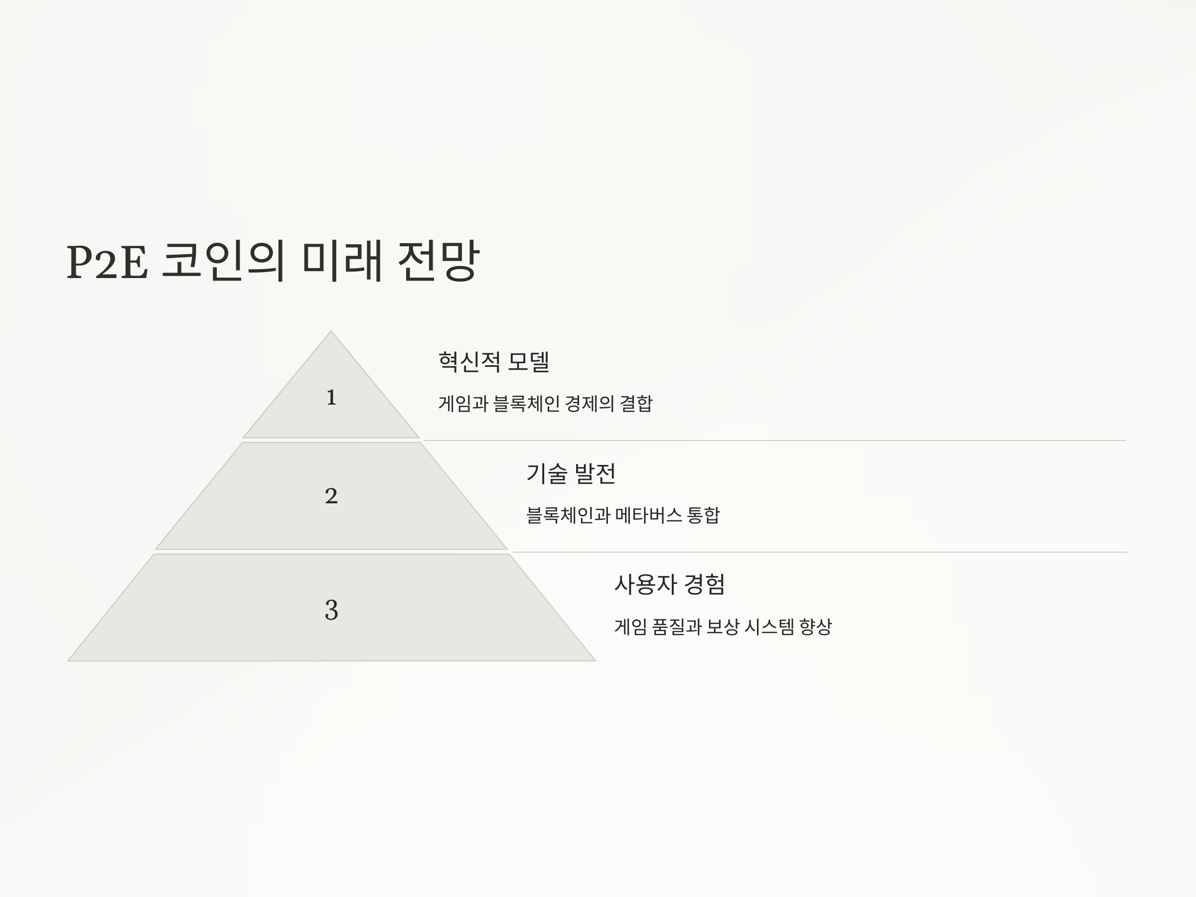 P2E 코인에 대한 전망은 매우 긍정적입니다. 기술 발전과 사용자 경험의 향상, 그리고 블록체인과 메타버스의 결합은 P2E 코인이 앞으로 더욱 확장될 수 있는 기반을 마련하고 있습니다. 다만, 시장의 불확실성과 리스크를 충분히 고려해야 하며, 이를 통해 안전한 투자 전략을 마련하는 것이 중요합니다. 2025년, P2E 코인은 게임과 블록체인 경제를 결합한 혁신적인 모델로 자리잡을 가능성이 큽니다.