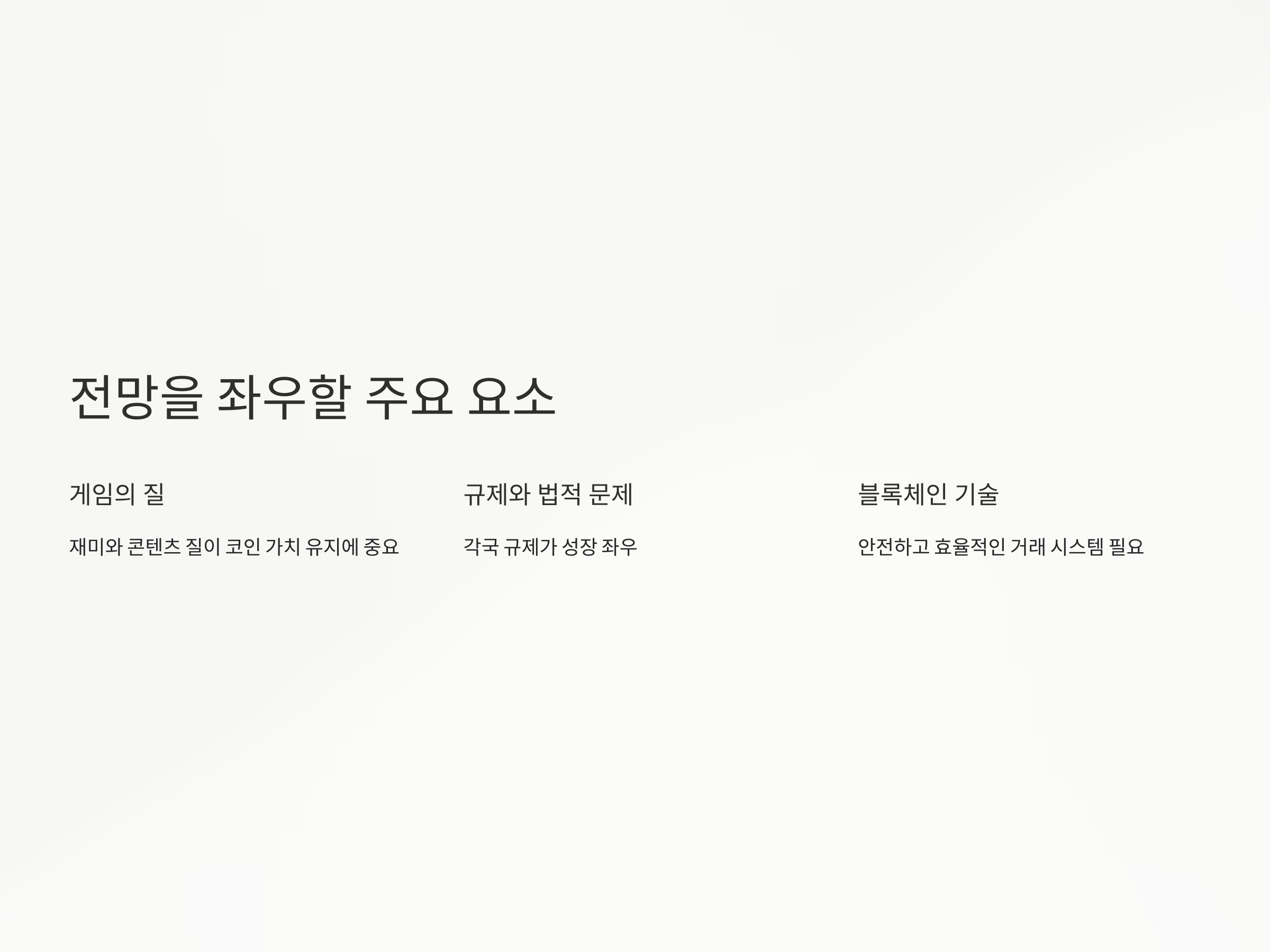 P2E 코인의 미래를 가늠할 때, 몇 가지 중요한 요소를 살펴볼 필요가 있습니다. 첫째, 게임의 질과 사용자 경험이 매우 중요합니다. 게임의 재미와 콘텐츠의 질이 높아야 유저들이 지속적으로 참여하게 되며, 이에 따라 P2E 코인의 가치도 안정적으로 유지될 수 있습니다. 둘째, 규제와 법적 문제입니다. P2E 코인이 더욱 보편화되기 위해서는 각국의 규제와 법적 요건을 충족해야 하며, 이는 코인과 게임의 성장을 좌우하는 중요한 요소가 될 것입니다.
