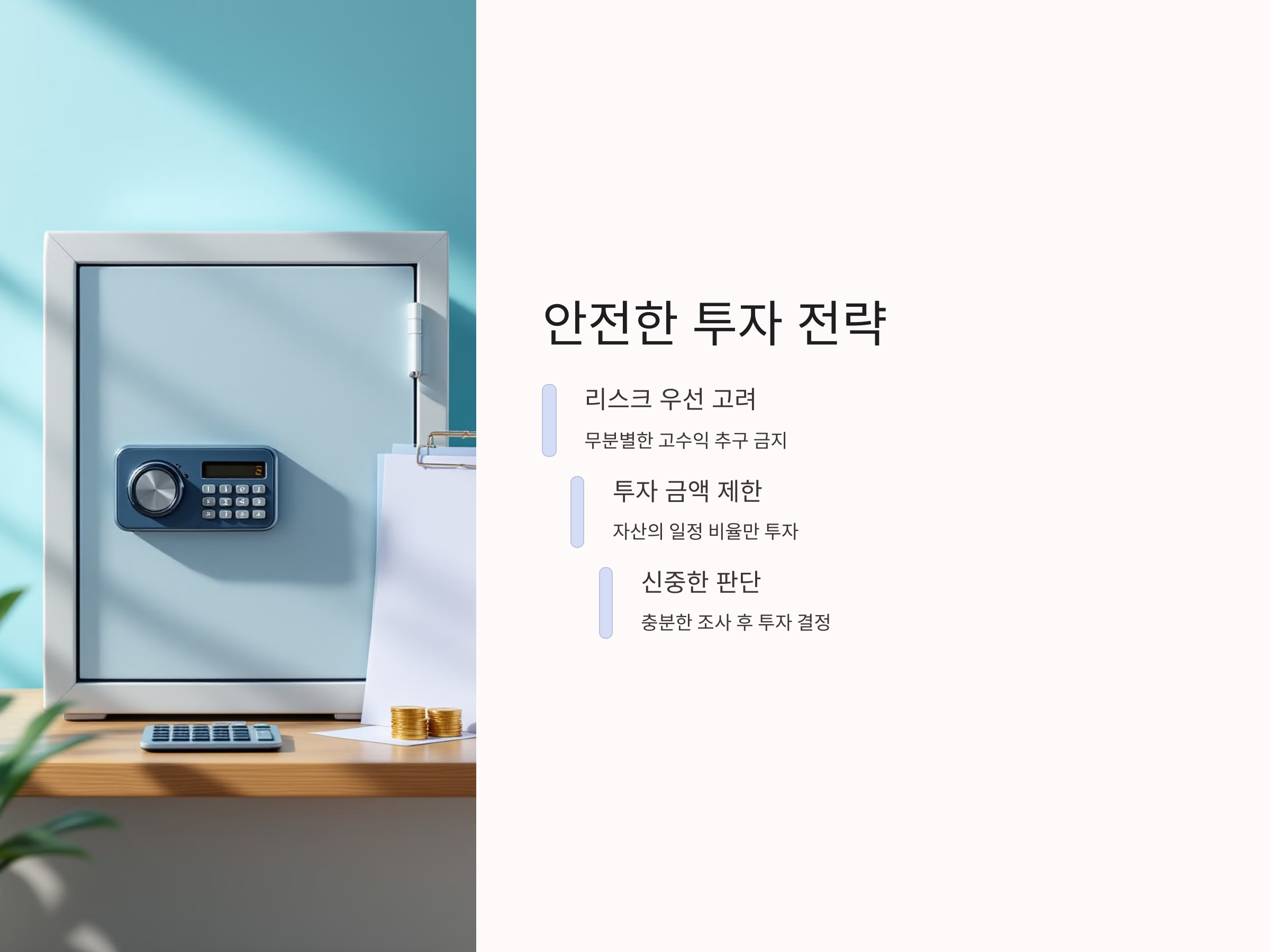 P2P 투자에서의 안전한 전략은 무엇보다 철저한 리스크 관리입니다. 투자자들이 자주 범하는 실수 중 하나는 P2P 투자가 높은 수익을 보장한다고 착각하고 무분별하게 투자하는 것입니다. 이를 피하기 위해서는, 항상 수익보다는 리스크를 우선 고려해야 하며, 투자 금액도 자산의 일정 비율로 한정하는 것이 좋습니다.