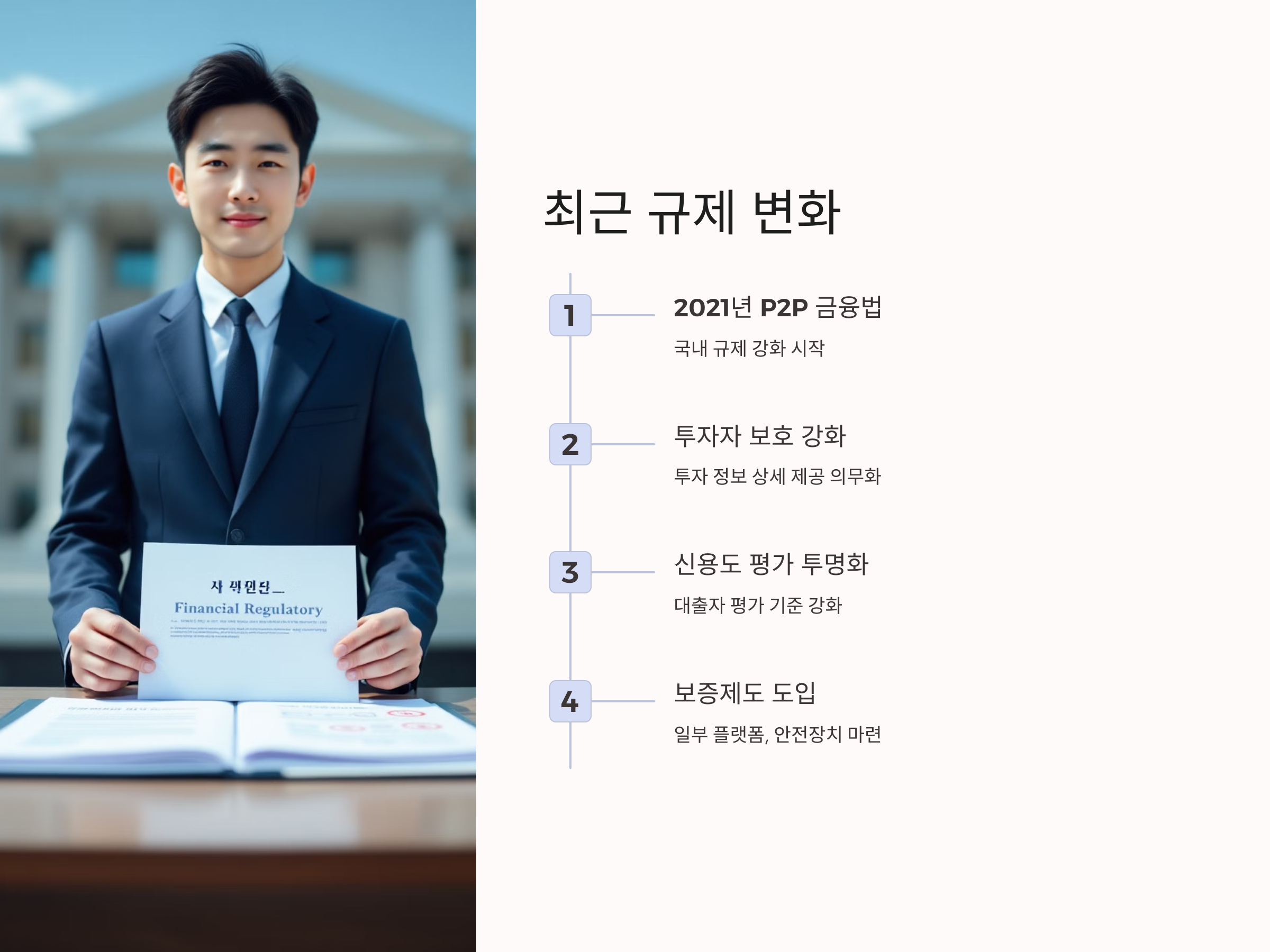 최근 P2P 투자는 국내외에서 증가하는 투자자들로 인해 규제도 강화되고 있습니다. 한국의 경우, 2021년부터 P2P 금융법이 시행되어, P2P 플랫폼에 대한 규제와 투자자 보호가 강화되었습니다. 이 법에 따라 P2P 대출 플랫폼은 투자자에게 투자 상품에 대한 정보를 더 상세히 제공해야 하며, 대출자의 신용도 평가도 보다 투명하게 이루어집니다. 또한, 일부 플랫폼은 일정 금액 이상 투자 시 투자자의 안전성을 보장하기 위한 보증제도를 도입하기도 했습니다.
