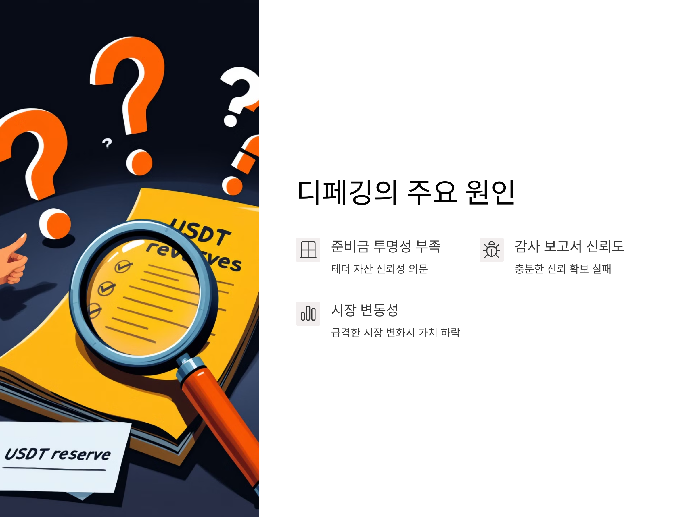 USDT 디페깅의 가장 큰 원인은 테더가 발행한 USDT가 항상 1달러의 가치를 유지하지 않도록 하는 여러 요인들에 기인합니다. 그 중 하나는 테더가 자산으로 사용하는 준비금의 투명성 부족입니다. 테더는 USDT를 발행할 때, 해당하는 준비금을 보유해야 한다고 주장하지만, 그 준비금이 실제로 얼마나 안전하고 투명한지에 대한 의문이 지속적으로 제기되고 있습니다.